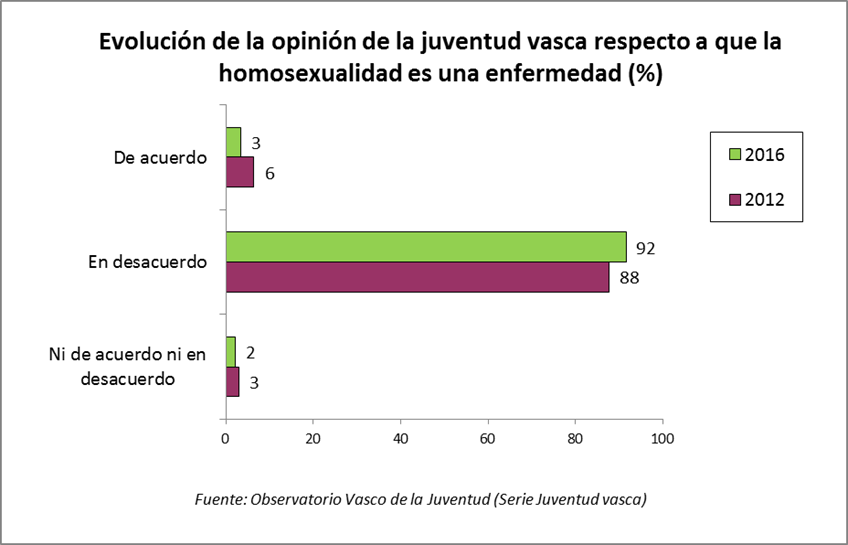 La juventud vasca es cada vez más tolerante. El 92 % de las personas jóvenes de 15 a 29 años están en desacuerdo con la frase “En el fondo la homosexualidad es una enfermedad y como tal debe tratarse” y únicamente un 3 % se posiciona de acuerdo con ella, menos que en 2012 (cuando era un 6 %).