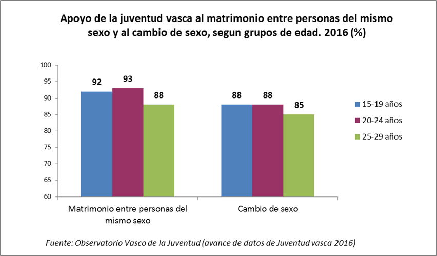 Además, la gran mayoría de las y los jóvenes vascos de 15 a 29 años se declara a favor del matrimonio entre personas del mismo sexo (91 %) y a favor del cambio de sexo (86 %). Estas opiniones están más extendidas ahora que en 2008 y 2012.