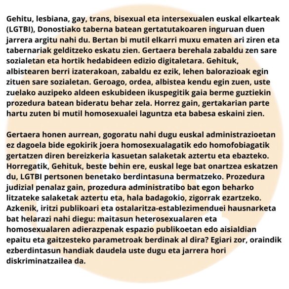 Gehitu, lesbiana, gay, trans, bisexual eta intersexualen euskal elkarteak (LGTBI), Donostiako taberna batean gertatutakoaren inguruan duen jarrera argitu nahi du. Bertan bi mutil elkarri muxu ematen ari ziren eta tabernariak gelditzeko eskatu zien. Gertaera berehala…