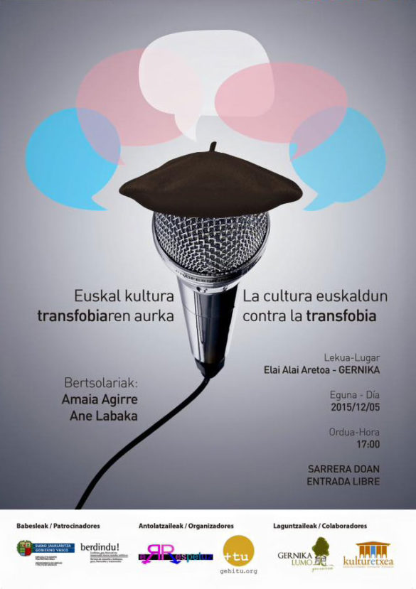 05/12 BERTSO JARDUNALDIAK – EUSKAL KULTURA TRANSFOBIAREN AURKA Sábado 05 Diciembre 2015 05:00pmEUSKAL KULTURA TRANSFOBIAREN AURKALA CULTURA EUSKALDUN CONTRA LA TRANSFOBIA Bertso jardunaldiakJornada de Bertsos. Elai Alaia Aretoa (Gernika) 17h.Entrada GRATUITA- Sarrera DOAN Bertsolariak:…