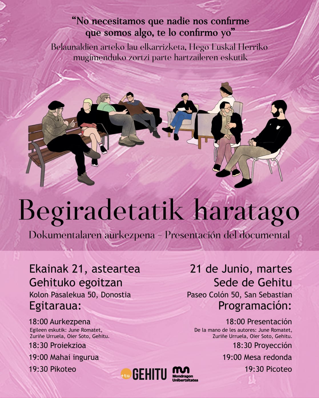 ✊??Arratsaldeko 18:00tan Mondragon Unibertsitateko lau ikasleek sortutako “Begiradetatik Haratago” dokumentalaren aurkezpena eta mahai ingurua egingo dugu… eta ondoren pikoteo goxo bat antolatuko dugu animatu!