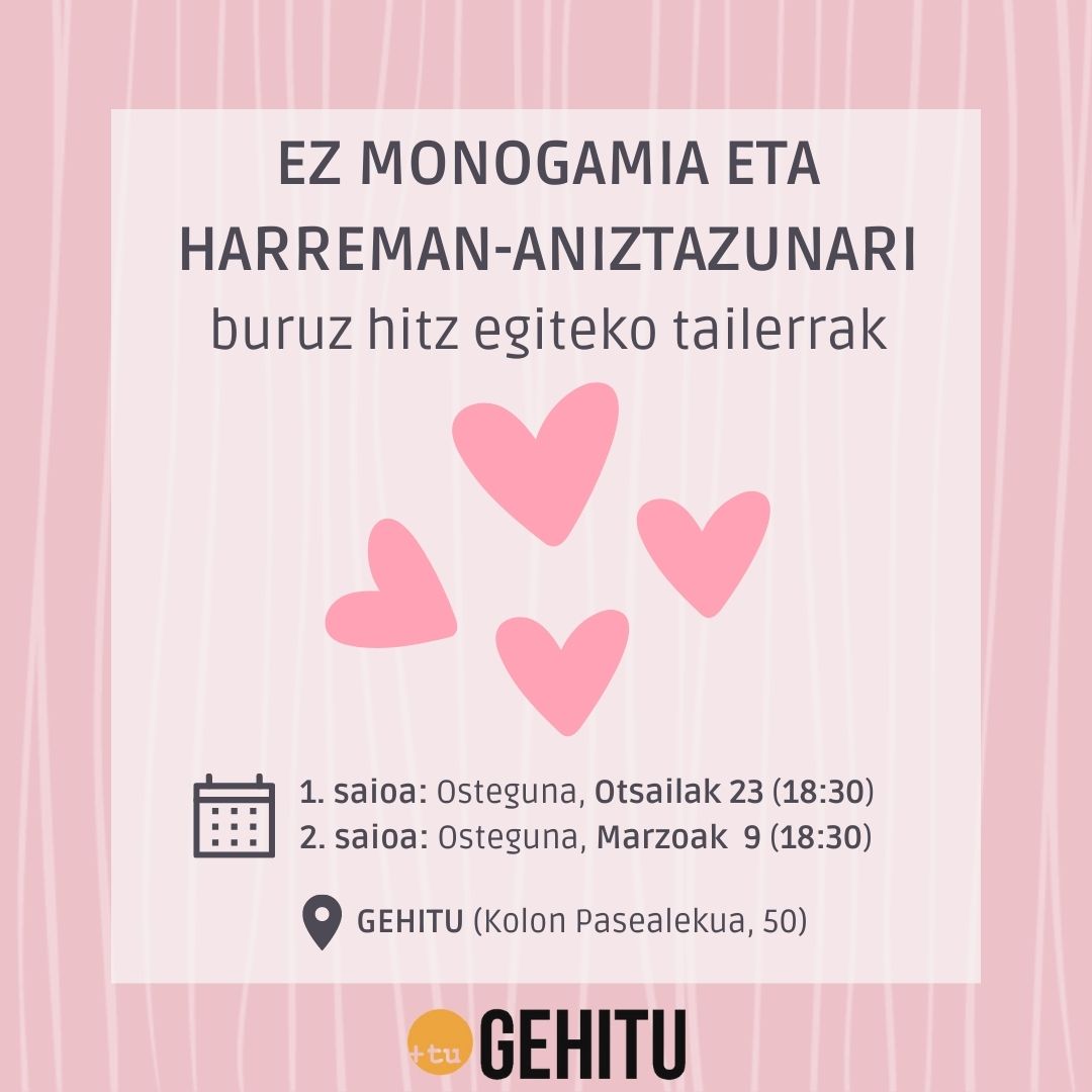 ? Otsailaren 23an (osteguna) eta martxoaren 9an (osteguna) itxarongo zaitugu, Gehituko egoitzan, 18: 30ean. ? Tailer hauetan monozentrismoari buruz eztabaidatuko dugu, harreman-eredu desberdinak ezagutuko ditugu eta gure harremanetan akordioak eta mugak nola ezartzen ditugun azalduko dugu.