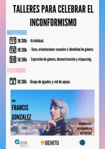 Junto con la ONG Mugen Gainetik llevaremos adelante los siguientes talleres de la mano de Francis Gonzalez: mujer trans, feminista y activista. Licenciada en psicología por la USC. Especializada en RRHH y peritaje jurídico forense. Actualmente doctorándose en peritaje jurídico forense e inadaptación social. Centrada en el ámbito del género y ajuste adolescente atendiendo tanto a variables biopsicoemocionales como a variables filioparentales.