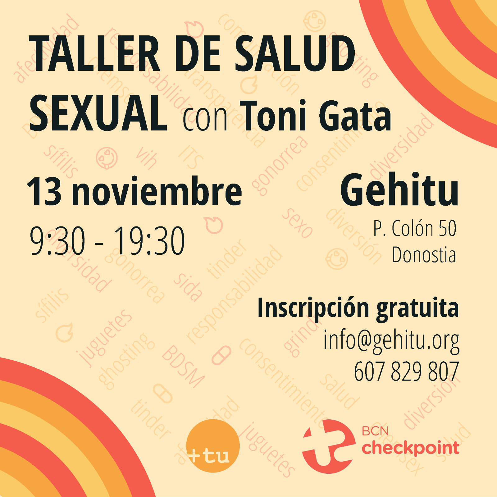 Azaroaren 13an, larunbata, gehituko egoitzan osasun sexualari buruzko tailerra egingo dugu Toni Gatarekin, BCN checkpoint-eko psikologoa. BCN checkpointen, Bartzelonan, STI diagnostikoak eta osasun sexualari buruzko informazioa ematen da, eta gizonekin sexu harreman dituzten gizonentzat eta emakume transentzat egokituta dago batez ere.