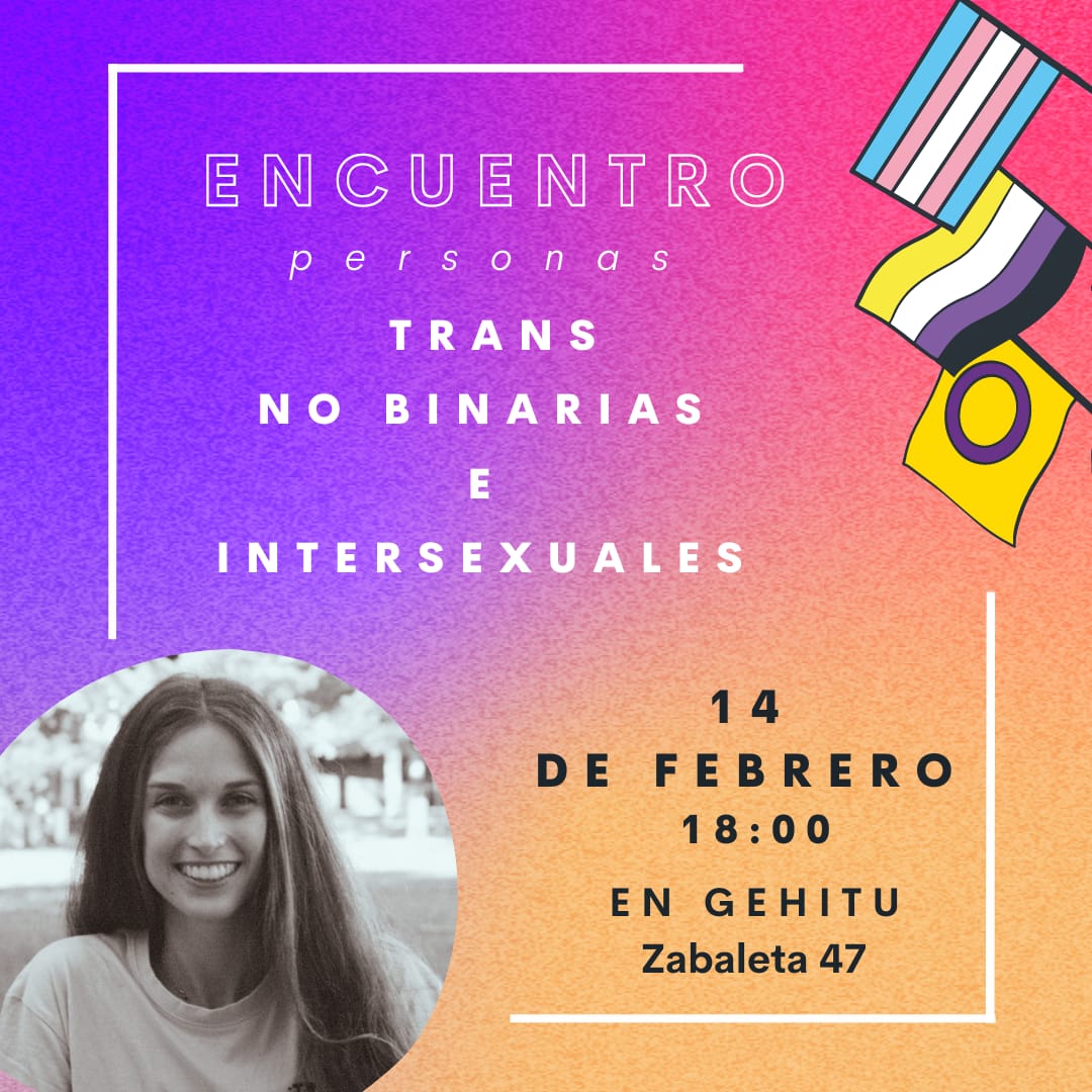 Pertsona trans, ez bitar eta intersexualen topaketa izango dugu otsailak 14an Gehituko egoitzean arratsaldeko 18:00etan. Zuen zain egongo gara!