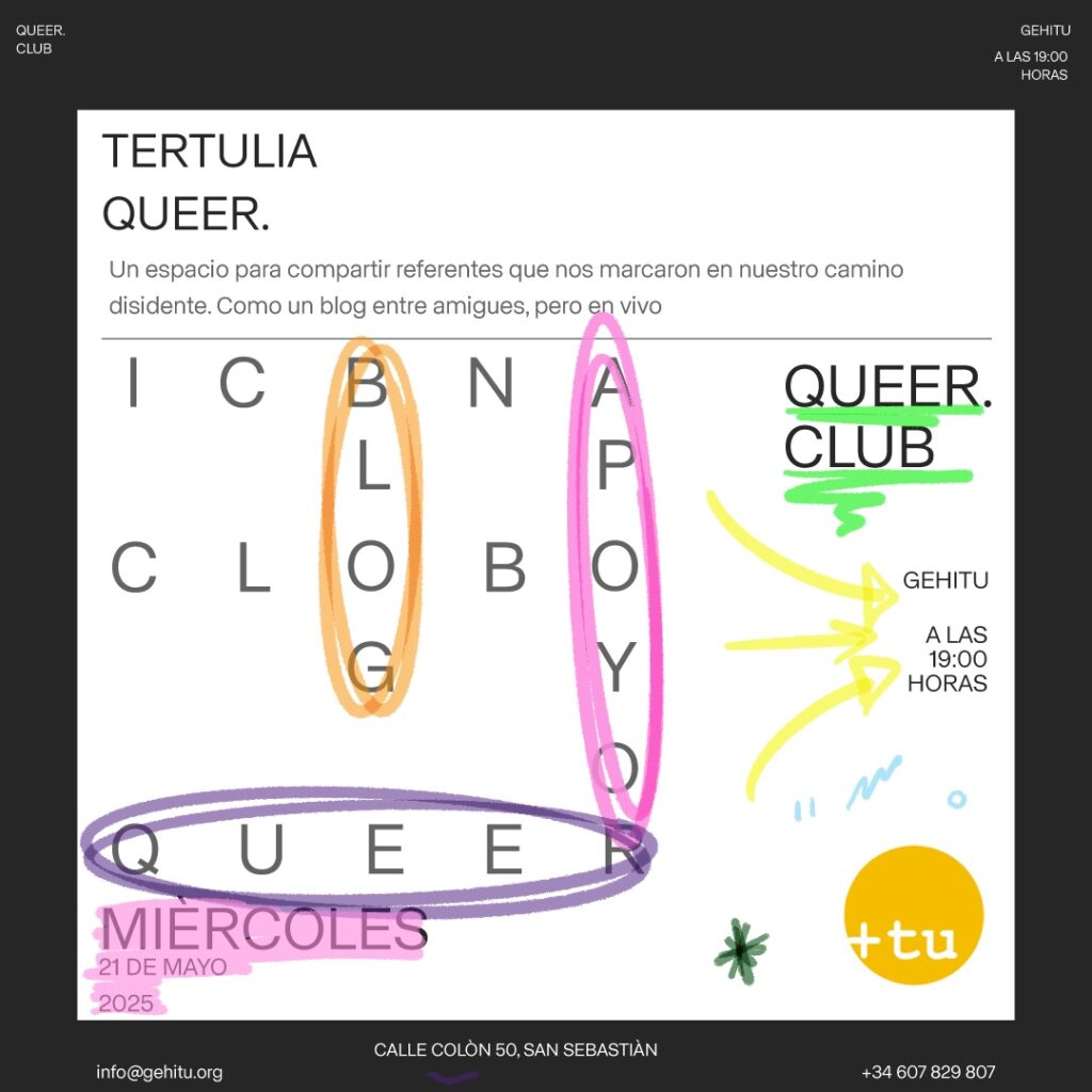 El próximo miércoles 21 de mayo nos reuniremos para nuestro quinto encuentro de Queer Club. Esta vez haremos un coloquio sobre referentes personales que nos marcaron en nuestro proceso de auto-descubrimiento: puede ser un libro, una película, una canción, un video… ¡lo que sea que te haya inspirado!